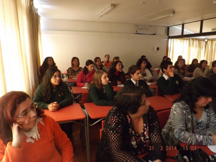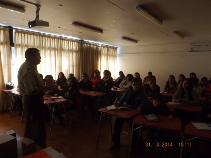 Charla dictada por el Suboficial Juan Carlos Espinoza a Las directivas de los Micro-centros, Centro de Estudiantes, Comité paritario, delegados de estudiantes. La presentación se enfocó principalmente en la seguridad en el transito y el trasporte escolar que se usa para acceder al colegio.