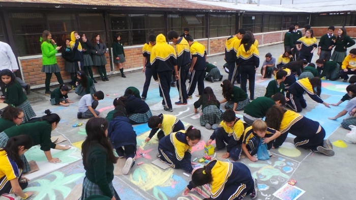 En la tarde del día jueves 15 de mayo se realizó una intervención artística en el patio pavimentado del colegio en donde estudiantes de Pre-kinder a Cuarto medio realizaron murales en el suelo utilizando simplemente tiza como recurso de dibujo y pintado. El tema principal fue el Mar, conmemorando el mes de Mayo, este tema fue orientado de diferentes maneras. Esta actividad logró reunir a todos los niveles del colegio en un solo lugar, creando un ambiente de unidad y alegría, demostrando actitudes de trabajo en equipo y solidaridad.