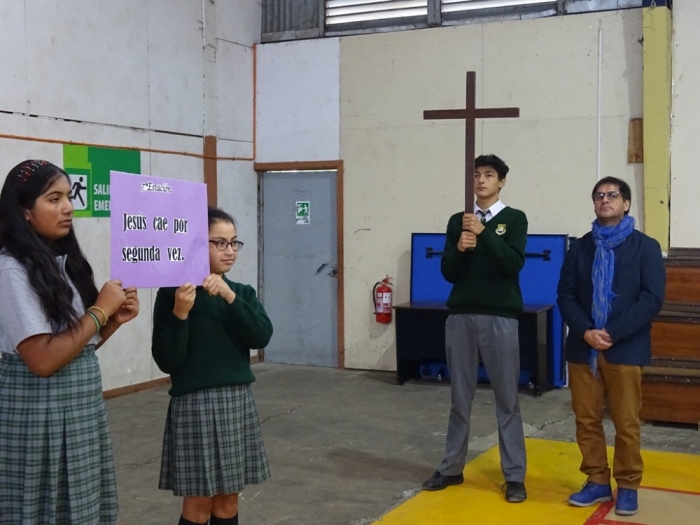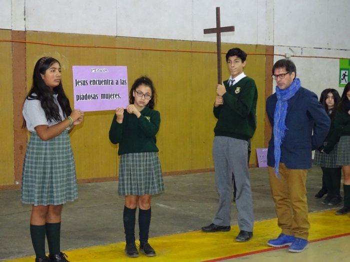 En Semana Santa nuestro Colegio vivió el Vía Crucis considerando a todos los ciclos en diversas instancias. Educación parvúlaria recreó los momentos mas importantes de esta celebración donde los pequeños de manera presencial y didáctica fueron participes de ella. Por su parte, en la Capilla, los estudiantes del Primer Ciclo Básico recordaron el camino que Jesús hizo por nosotros en una muestra de Amor. Desde 5º Básico a 4º Medio, los estudiantes junto a sus profesores, participaron de los momentos de la Pasión de Cristo en el Gimnasio, donde el Padre Rodrigo motivó a todos los presentes a vivir estos tres días sagrados con mucho recogimiento en compañía de sus familias para encontrarnos el día lunes con un Jesús resucitado.