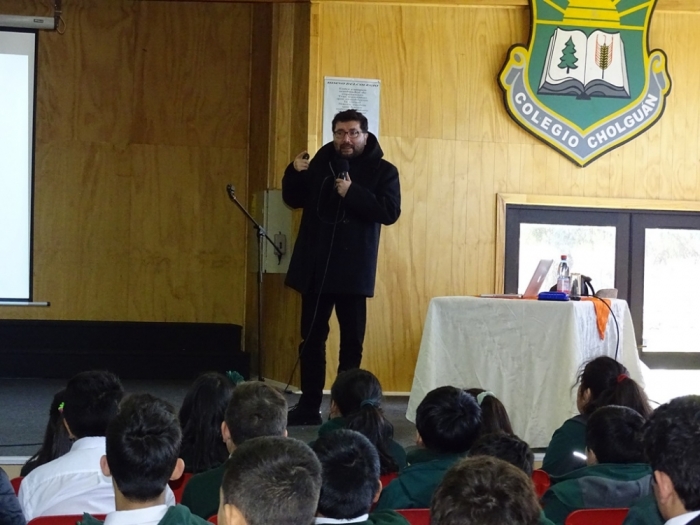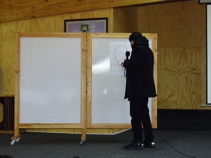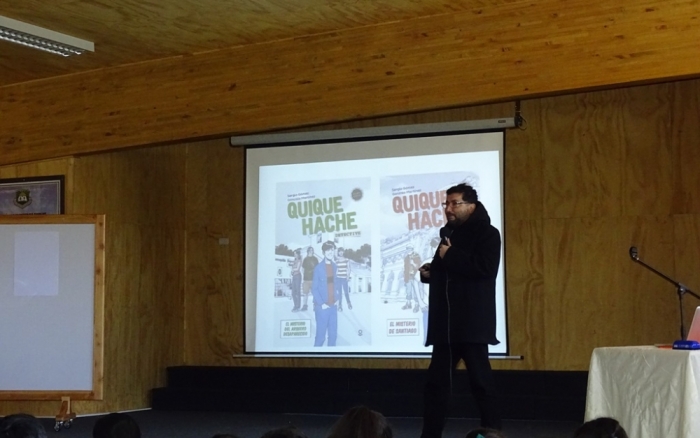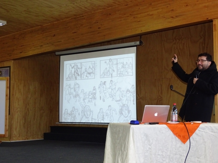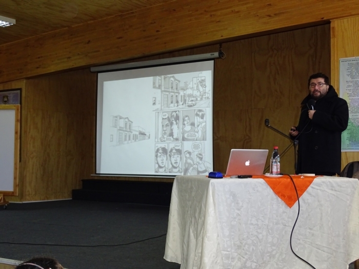 Gonzalo Martínez inició su presentación contando cuáles fueron sus inicios y particularmente cómo se gestó la motivación que le llevó a crear cada una de las historietas , mostrando a los presentes imágenes que plasman cada etapa de su proceso creativo. Finalmente, respondió a las preguntas de los alumnos y elaboró para ellos uno de sus principales dibujos.