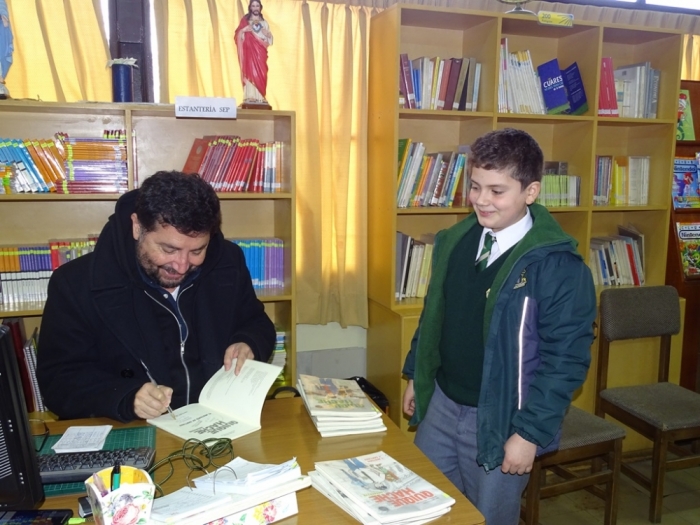 Un especial momento vivió nuestro alumno Vicente Silva Sánchez frente a la visita del autor de historietas Gonzalo Martínez a nuestro colegio. El alumno de Sexto Año Básico compartió con el autor sus propias historietas , recibiendo el elogio y motivación de Gonzalo Martínez para continuar desarrollando este talento creativo frente al cual se mostró gratamente sorprendido. Para Vicente, ésta fue una experiencia muy especial y que, sin duda, marcará un impacto trascendente para su futura vida profesional. A continuación algunas imágenes que capturaron este instante.