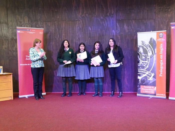 El martes 23 de agosto se realizó la premiación del 5° Interescolar de Spelling Bee de la Universidad Andrés Bello, instancia en la que nuestras alumnas María Cristina Leiva, Manuela Muñoz Panes y Fernanda Estrada Zavala recibieron una distinción por alcanzar el Primer Lugar en la Categoría A de 1° y 2° Medio.