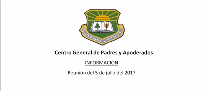 Se cita a reunión obligatoria Centro General de Padres y Apoderados Colegio Cholguán para el día miércoles 5 de julio a las 18:00 horas. En casino del colegio. Se ruega asistencia y puntualidad.