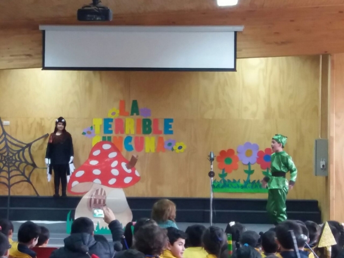 El tercer año básico en el marco del acto matinal del colegio, presentó exitosamente el día Martes 08 de agosto la obra de teatro “La terrible cuncuna” de la escritora chilena Alicia Morel, dirigidos por su profesora jefe, señora Máxima Sanhueza.