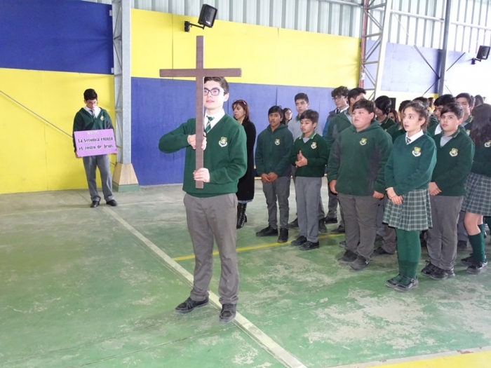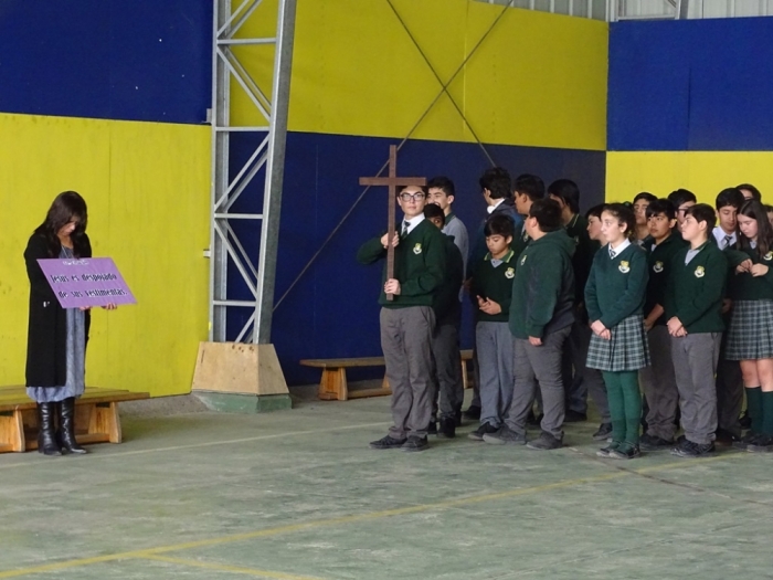 De Séptimo Básico a Cuarto Medio en el Gimnasio del Colegio se hizo el recorrido de las catorce estaciones del Vía Crucis, la Pasión y Muerte de Jesús.