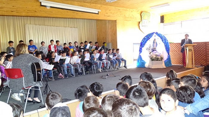 El Día viernes 06 de Diciembre del 2019 a las 08: 15 hrs, se dio termino del Mes de María como es una tradición en nuestro colegio en el Salón de del establecimiento, donde la Fe fue expresada a través del coro compuesto por niños y niñas de tercero y cuarto Básico dirigido por la Profesora Marcela Vidal. La Virgen fue adornada hermosamente por las tías Cecilia A, Jeanette B. Evangelio de San Juan el centro de la Palabra de Dios es la entrega de María a su Discípulo Amado Juan. Se Oró por la Paz de Chile, por ser mejores personas y cristianos.