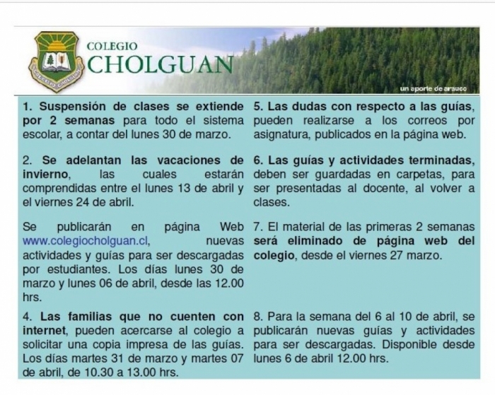 3.- Se publicarán en página Web www.colegiocholguan.cl, nuevas actividades y guías para ser descargadas por estudiantes. Los días lunes 30 de marzo y lunes 06 de abril, desde las 12.00 hrs.