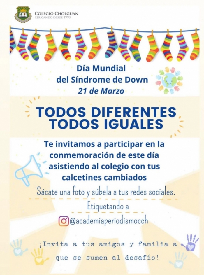 En el año 2011, la asamblea general de la ONU, designa el día 21 de marzo como el día internacional del síndrome de Down. El síndrome de Down propiamente tal, siempre ha formado parte de la condición humana, se encuentra en todas las regiones del mundo y hoy, nuestro colegio Cholguán, no ha querido dejar pasar esta importante fecha.