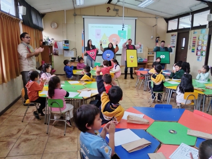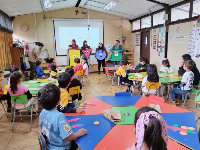 Al igual que la actividad de pre-kinder, se comenzó con una canción en donde las figuras geométricas fueron ingresando a la sala, realizando una coreografía e instando a los estudiantes a bailar junto a ellas (https://youtu.be/Nsh87p7BSno). Luego, se relató el cuento sobre la importancia de las figuras geométricas, para continuar con actividades como de identificación y relación de objetos reales con las figuras, construcción de figuras compuestas y finalizando con la entrega de medallas y las guías de refuerzo.