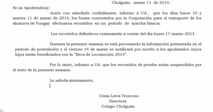 Junto con saludarle cordialmente, informo a Ud., que los días lunes 10 y martes 11 de marzo de 2014, los buses contratados por la Corporación para el transporte de los alumnos de Yungay efectuaron recorridos en un período de marcha blanca.